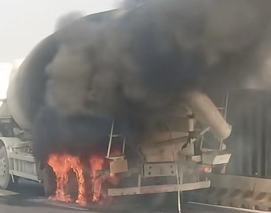 途经现场的驾驶员介绍,起火的是一辆水泥搅拌车,当时该车停在最右侧车道上,车辆后轮处有明火,车辆轮胎燃烧产生大量黑烟。由于温度较高,搅拌车后方罐体被熏黑。事故发生后,搅拌车驾驶员下车并报警。