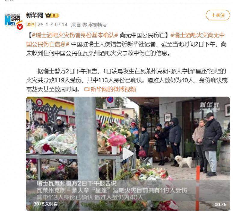 中国驻瑞士大使馆告诉新华社记者,截至当地时间2日下午,尚未收到任何中国公民在瓦莱州酒吧火灾事故中伤亡的信息。
